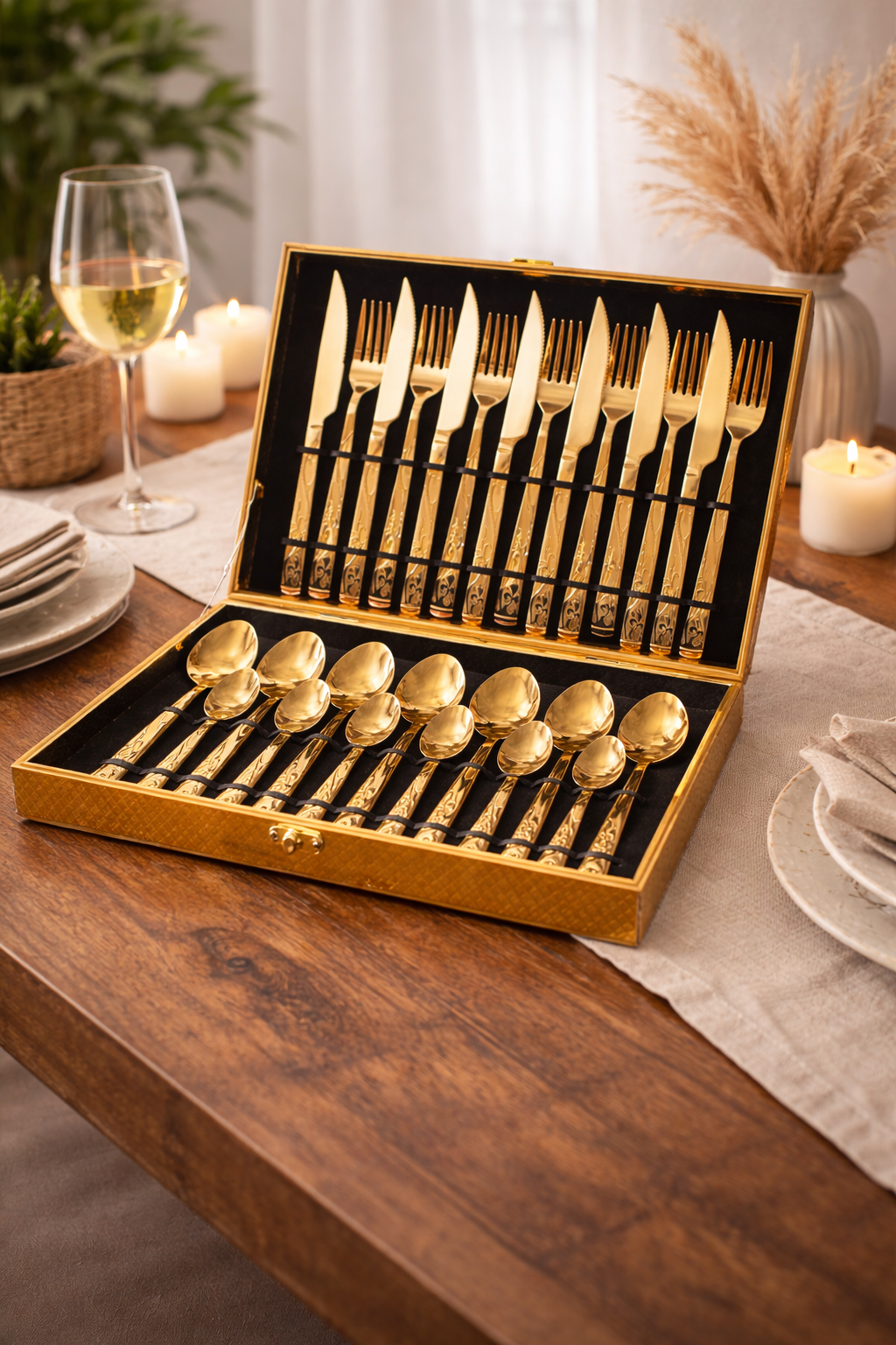 Kit em aço inox com acabamento dourado e maleta organizadora, unindo sofisticação e praticidade à mesa.